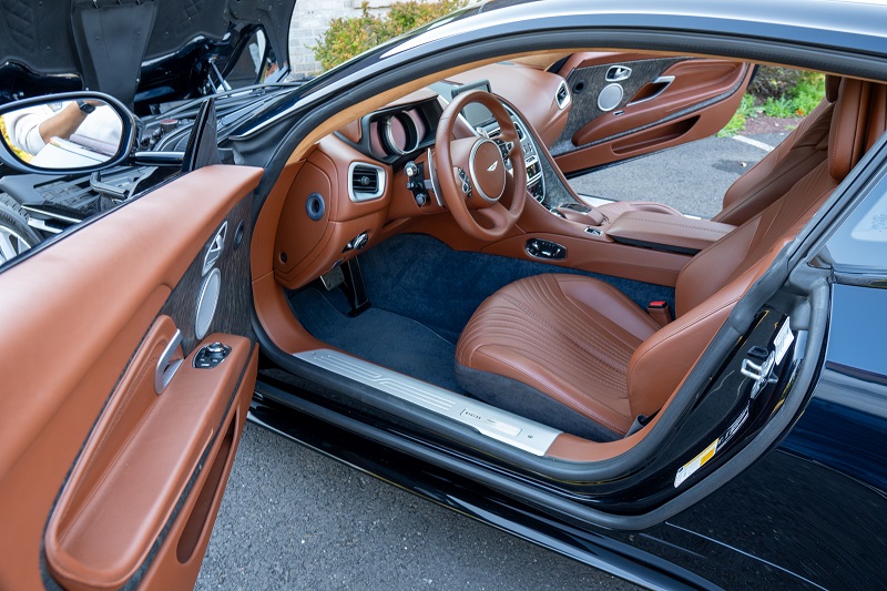 Enjoy the beautiful body lines that are accentuated by The Ultramarine Black paint. At a glance it looks black but is actually a dark metallic blue. The Chestnut Tan leather with Caspian Blue carpets bring out the luxury and comfort Aston Martin is famous for.